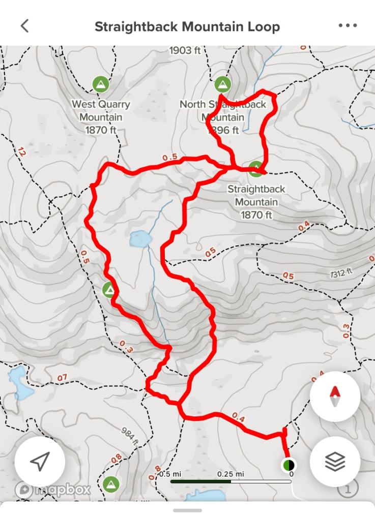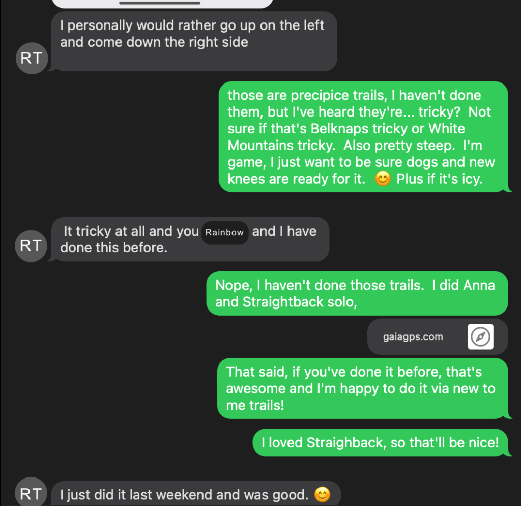 Frequently, when we plan to hike, we agree on a summit and I research and plan the route. This time I let Right Turn take charge. Both because she is recovering and I wanted to let her pick what’s best for her knee and also because Ruth has a puppy that she’s gradually building up to bigger hikes. So Right Turn sent the following screenshot from AllTrails.