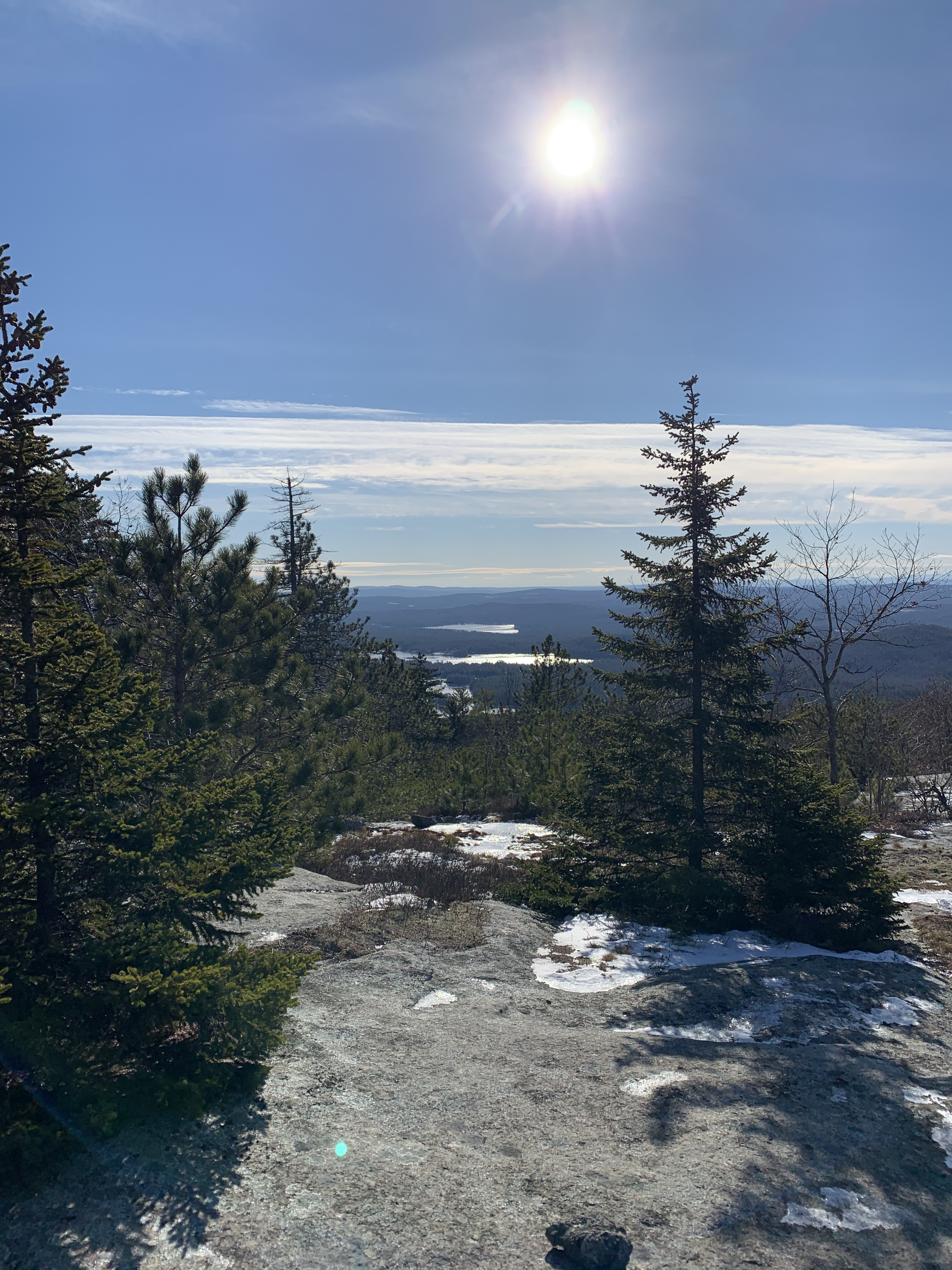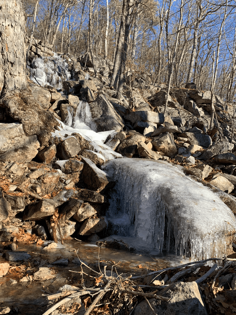 Of course, I did also face plant twice on completely flat stretches near the summit. We had taken off our spikes after the waterfall and should have put the back on as there were some icy bits. I kept expecting the summit to be clear because it is open and the wind would have blown off any snow. In these “in between” conditions, I often find myself thinking “I should put on my spikes” and then it’s bare ground, so I don’t, and then I hit an icy patch. It’s annoying to put them on and off, so frequently I wait too long to put them on. Well, two faceplants in, I put them on again. (I was fine, I think all those pushups and burpees at the gym are paying off).