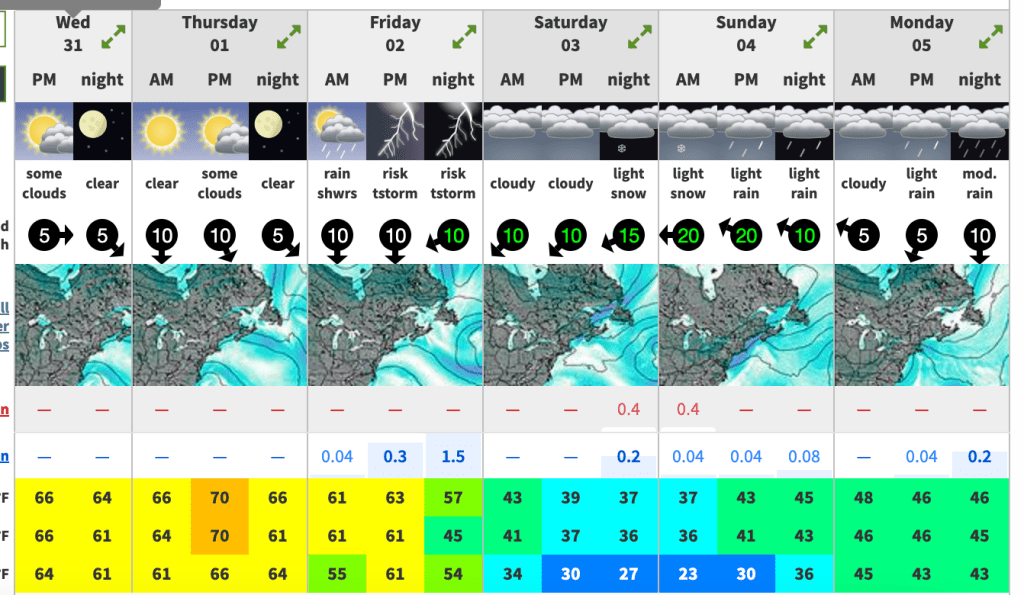 Yes, you’re reading that correctly. Thursday, at 4000 feet elevation, 70 degrees. When we were going to be backpacking? 36 degrees and snowing. We continued to watch the forecast and make a decision as we got closer. As of Friday afternoon, the precipitation had gone from the forecast and it would be cold, but seemingly bearably cold. Saturday morning, we woke up to this forecast…