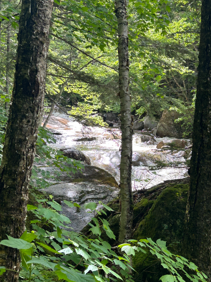 The red line is the actual trail starting at the bottom of the image, going up and then left. Blue up to the pond is Black Pond Trail. Blue from Black Pond up to the red is not an official trail. However, so many people have taken it, that it’s shown in apps like Gaia and AllTrails. It’s also very easy to see and follow in person. We were taking the bushwhack, not to shorten the hike (though that’s an added bonus), but because the bushwhack eliminates something like five water crossings.