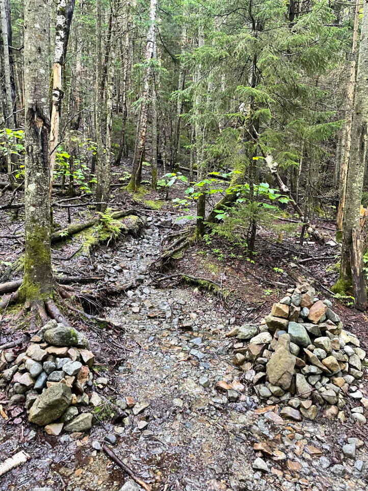 The two cairns marking Owls Head Path. Not a bushwhack, but also not an official WMNF trail, which mostly means no signs or blazes or trail maintenance.