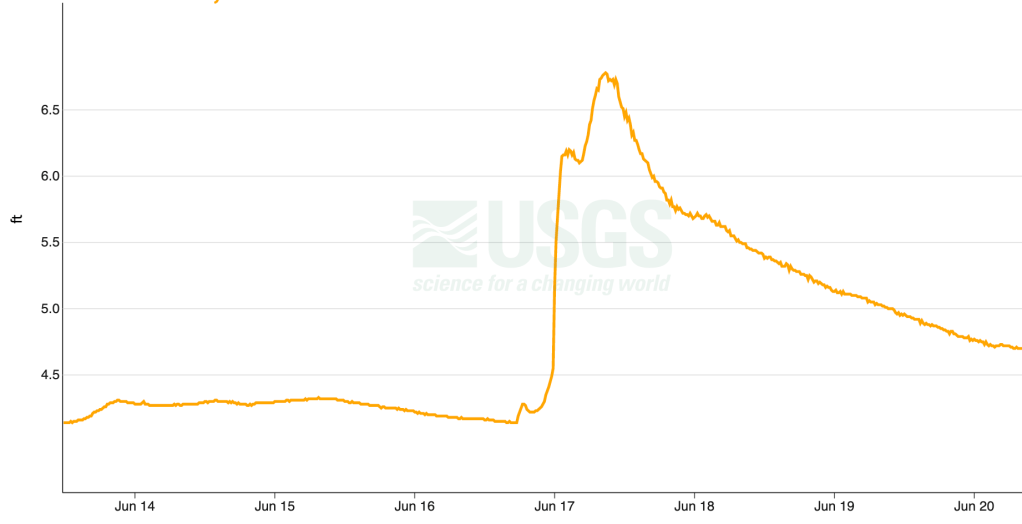 Noon on Sunday, the water level was where the orange line is at 5.5 feet. A little over a foot higher than normal. This isn’t the same river, but a nearby one, and at least a good gauge of relative levels.