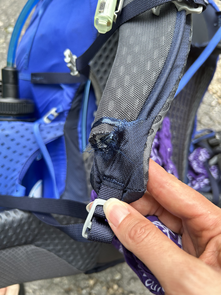 I had a conundrum. I had a broken pack, and another trip scheduled in two weeks. And a weirdly short torso. And no time to try out a new pack. So I went online only to find the Gregory Octal was discontinued (gee, I wonder why), BUT REI’s used gear site just so happened to have a Women’s XS listed. Hoping the frayed straps were a fluke, and without much choice, I ordered it. It arrived on time and looked to be in good condition. I went on my overnight hike. And the same exact thing happened, only this time to BOTH shoulder stabilizing straps.