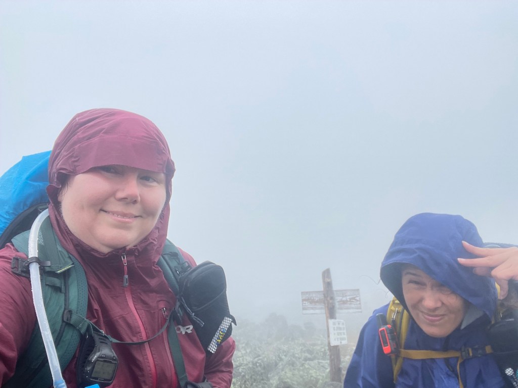 Mt. Adams summit selfie, #46! Photo credit Rainbow. At this point, it was slightly windy and foggy, but still dry. Note, my jacket is unzipped for ventilation and we’re mostly still able to smile.