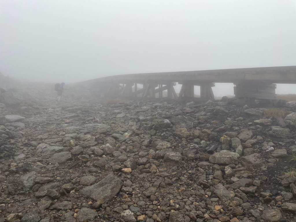The fog/clouds increased. The wind increased. The rain eased up some, though we were still wet thanks to the fog/clouds. These three photos were all taken by Rainbow, because I didn’t bother to take out my phone. While it wasn’t a huge amount of elevation, the hike was still tough. Lots and lots of rocks. All rocks, all the time. And then we were stressing about thunderstorms returning. Visibility was obviously terrible, and we were frequently just hiking cairn to cairn.