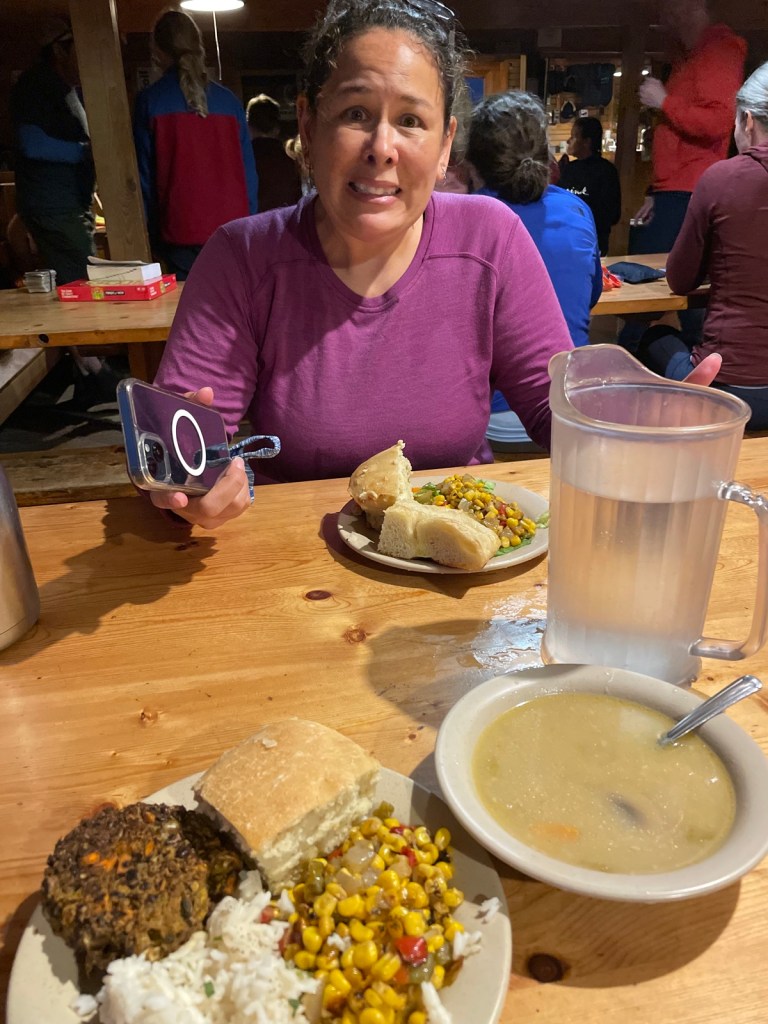 We walked into the hut just around 7:30 PM, while it was still barely light out. Relieved, we walked up to the desk. The croo member greeted us and checked us in, told us what bunk room we were in. None of that mattered until they said, “don’t worry, we’ll get some dinner for you”. We went to our bunk room (dripping water everywhere, sorry everyone!). Took off our packs and changed into our camp shoes. I didn’t even change my clothes I was so hungry.