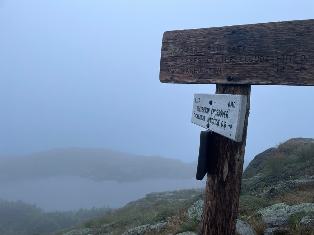 I began to get nervous that we wouldn’t get to the hut by dinner (6PM). Then I began to get nervous we wouldn’t get to the hut before dark (7:30 PM). While we are prepared to hike in the dark, and have hiked in the dark before, this was not the place for it. With the fog and the rock fields that were the trail, we were just hiking cairn to cairn. But cairns are too far apart for a headlamp to pick up. We had to hike as quickly as we could, while still being safe. The rocks were getting slippery. As I mentioned before they would move under your feet. Rainbow slipped a couple of times, which naturally makes you much more cautious and slows you down. Finally we got to Westside Trail, which “shortcuts” to the Lakes of the Clouds hut, skipping the summit of Washington. It also goes under the cog rail.