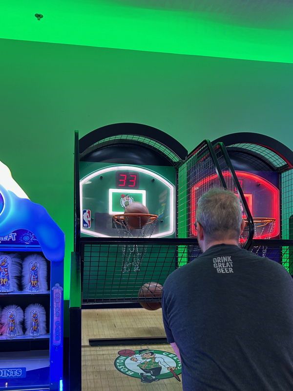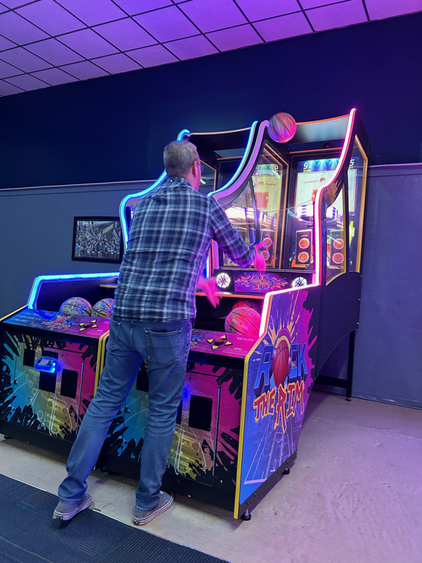 After bingo, we headed to the arcade (as usual at this point), and lots of people were in there, too. But GASP! SADNESS! The basketball game was broken! So what happens when something is broken and you’re around technical/mechanical people? You all fix it yourselves. And then celebrate with some pool.