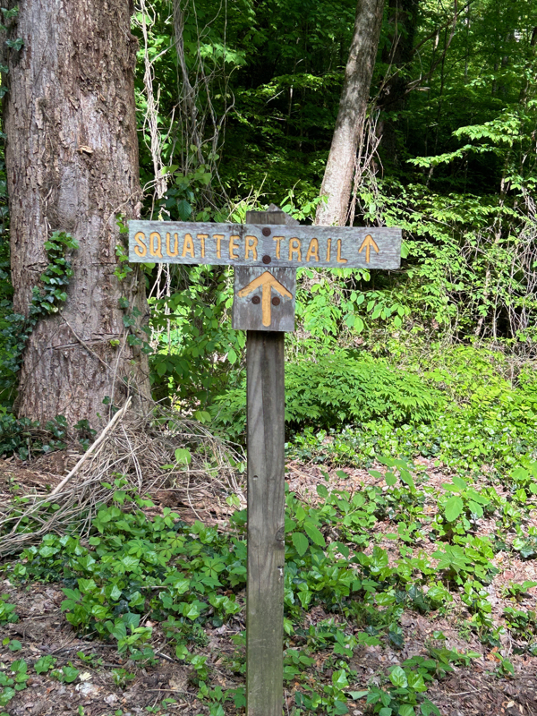I started off on the Squatter Trail (not sure I want to know why it’s called that). It seemed like eventually these trails would link up with the Appalachian Trail, so that was my hope. However, this trail is not one of them. It seemed very rarely used. Very overgrown and I wasn’t sure if there was poison ivy, so after a short while, I turned around to head to another trail. This was only more slightly used. However, I had a nice view over the village. Dead center of the bottom right photo, you can see a little flash of blue. That’s Ariel, parked in front of our cabin.