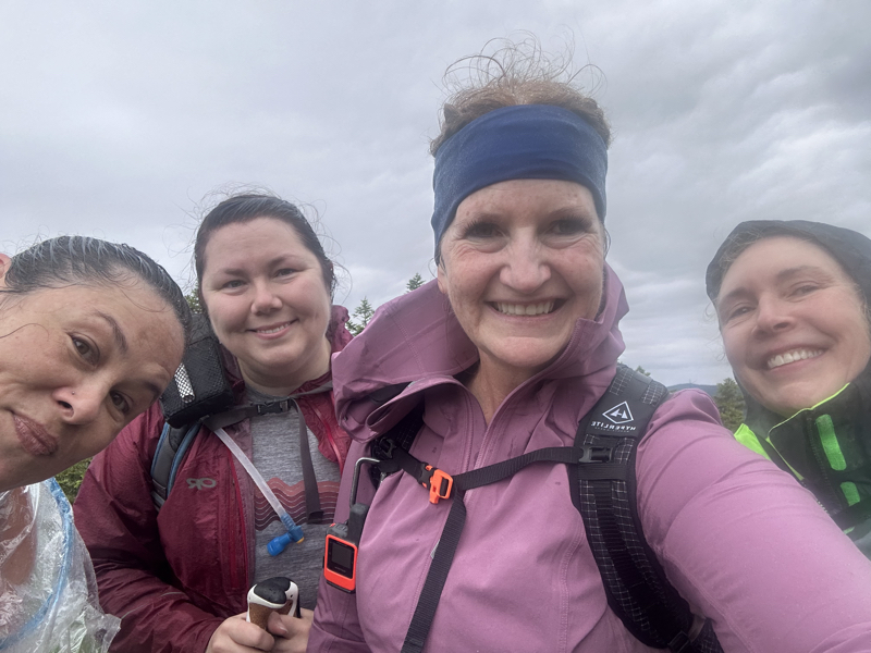 The hike is a nice, gradual hike through the forest to start. Right Turn, Rainbow, and I had a great time catching up, as well as getting to know Kate and her pup Maisie. It started to sprinkle. I started to get a migraine (a more and more frequent occurrence lately), so we stopped for me to take some meds. Then it started to rain, and get windy. Of course it got worse just as we were on the open (exposed) granite slabs. We donned rain gear.