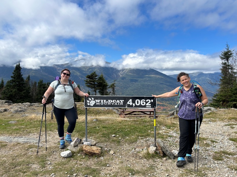 We made it to the “summit”, aka where the chair lift ends and there is a sign, a picnic table, and a ski patrol building. Also where I had made it with Right Turn, and I cried, and we bailed. There is still a bit more to go to the actual summit of Wildcat D. Oddly, there was a very home made looking sign stuck on a ski pole that said “Easier way to the summit”. We took it, and it may have been the only “hike” feeling part of the whole day. There is a viewing platform at the summit, where took the customary summit selfie.