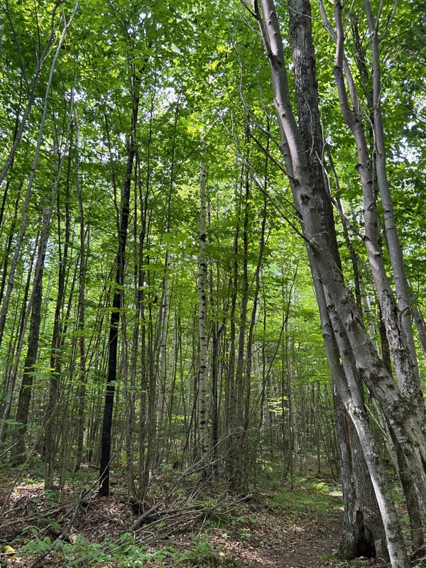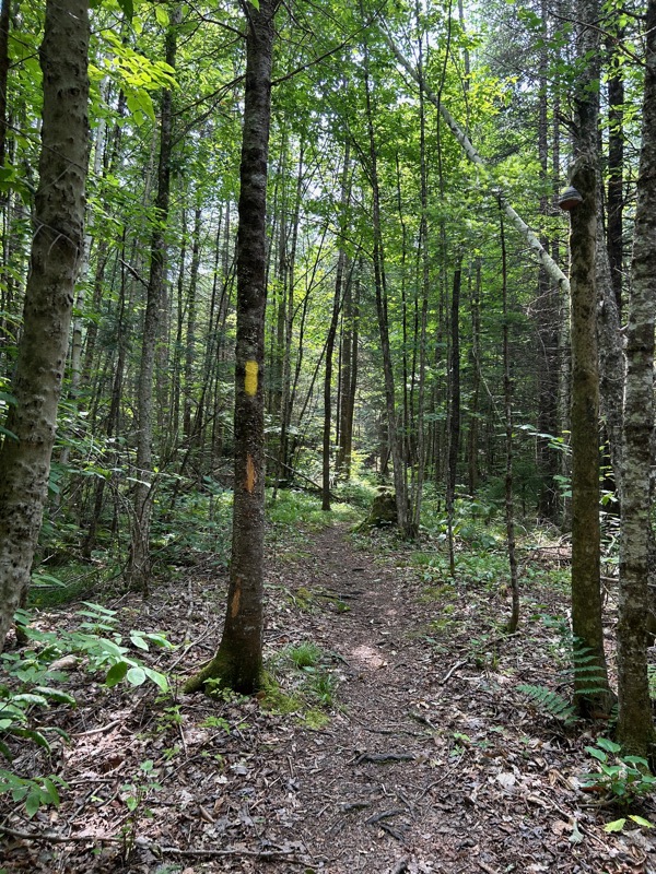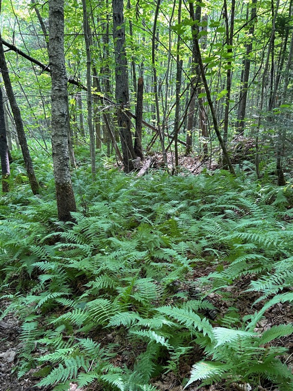 The trail is on private property. You depart the parking area through some trees and are on a gravel road. Watch for the sign that shows NOT to ascend the private road, and another sign that shows the patch into the woods. The trail is lovely with lots of ferns and birch trees.
