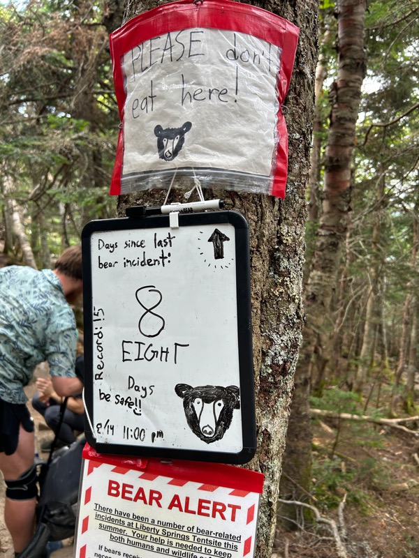 Here there was also a sign warning hikers not to leave their packs unattended. A common practice is to drop your pack before a side trail to a summit, so you can hike without the weight, then come back and grab your pack. However, with the problem bear roaming around, apparently he knows hikers leave packs here and that means a free lunch. The sign said packs left at this exact spot have been dragged off by the bear.