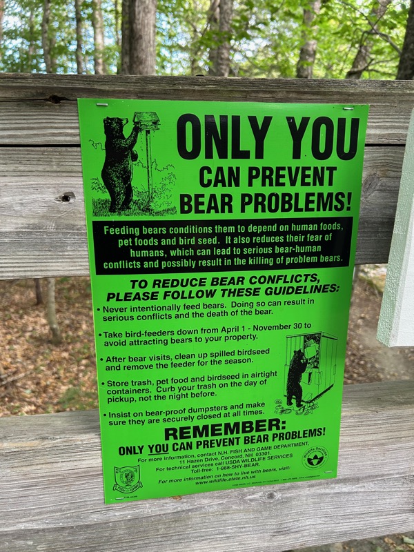 Also, you note the sign about bears. There is currently a “problem bear” making the rounds in the area. We live in Black Bear country, which means we aren’t really in danger, BUT the problem is that poor HUMAN behavior means bears figure out that humans mean food they can eat, and they start to hang around humans looking for food. Unfortunately, if a bear becomes too much of a problem, the bear has to be put down. All because humans are too dumb to clean up after themselves and store food properly. <steps off of soap box>