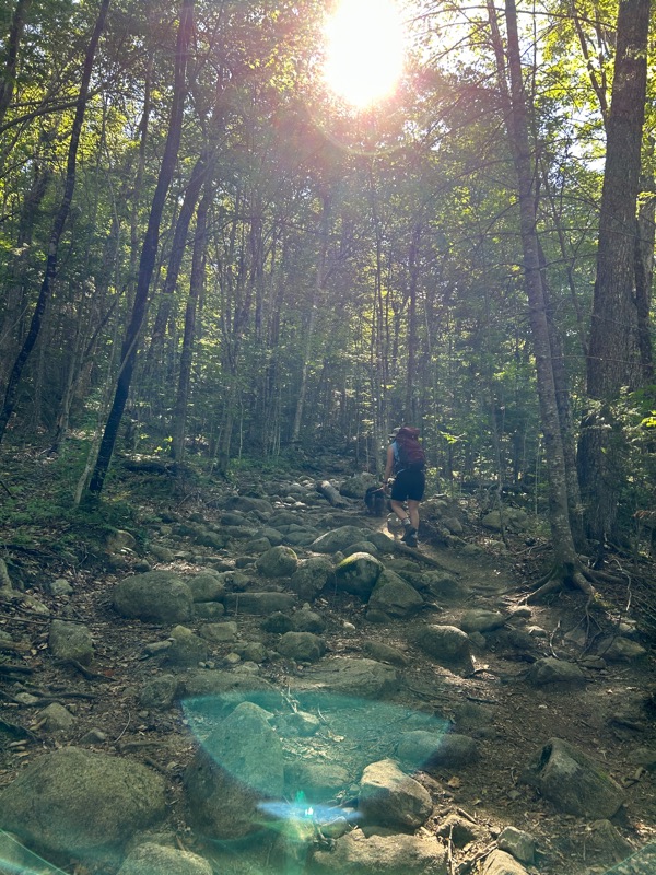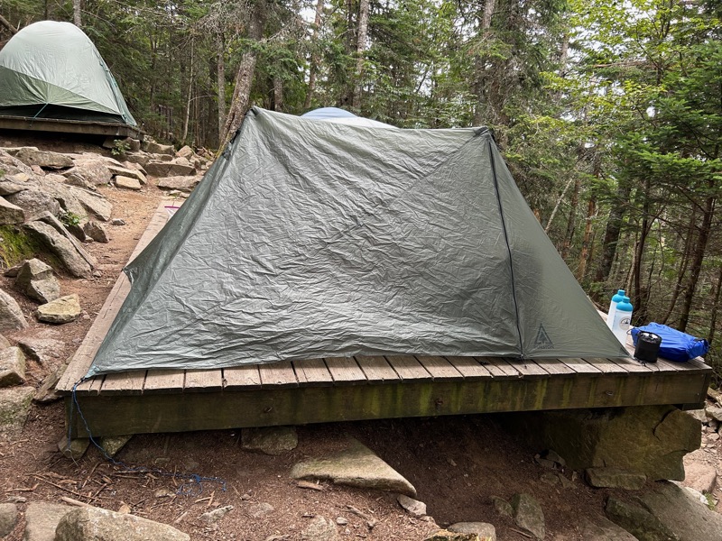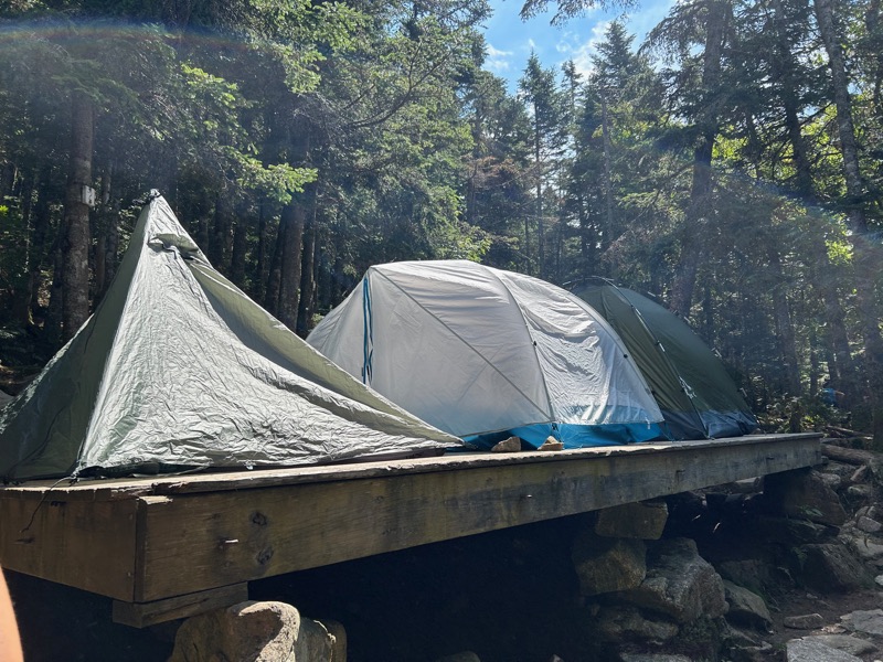 We reached the junction with the Flume Slide trail, and continued on Liberty Spring trail. At around the 2 mile mark, it begins a steady, steep climb to the tentsite. In one and a half miles, you gain roughly 1,800 feet of elevation. (Or climbing the Empire State Building 1.25 times). It was hot and humid. Temps were in the 70s and 60% humidity, even at elevation. I was sweaty and really just wanting to get to the tentsite.