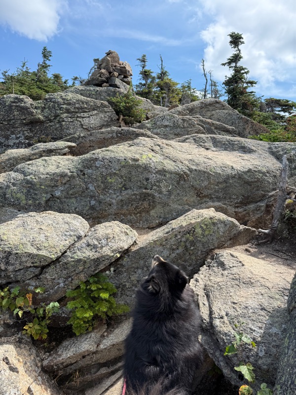 Way back in 2018, when I did this trip the first time, I described this rocky ledge/scramble part. As we got here, the Bartender asked if this was the summit, and I said no, and pointed out the actual summit. It’s not very far from that spot, but it LOOKS impossibly hard to get to. The Bartender sat down and said no. She noped out right there and then. And I don’t blame her. I’m afraid of heights, and even knowing I’d done this before, I was still a bit shaky. I told her that she could do it. If I could do it, she could do it, and it looks way worse than it is. We took the little bypass, which goes next to the boulders (rather than on top of them, which is the scariest part) and has the safety of trees, while Awestruck, Beth, and Lilja went up over the top. Then to the actual summit!