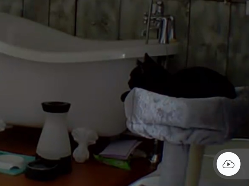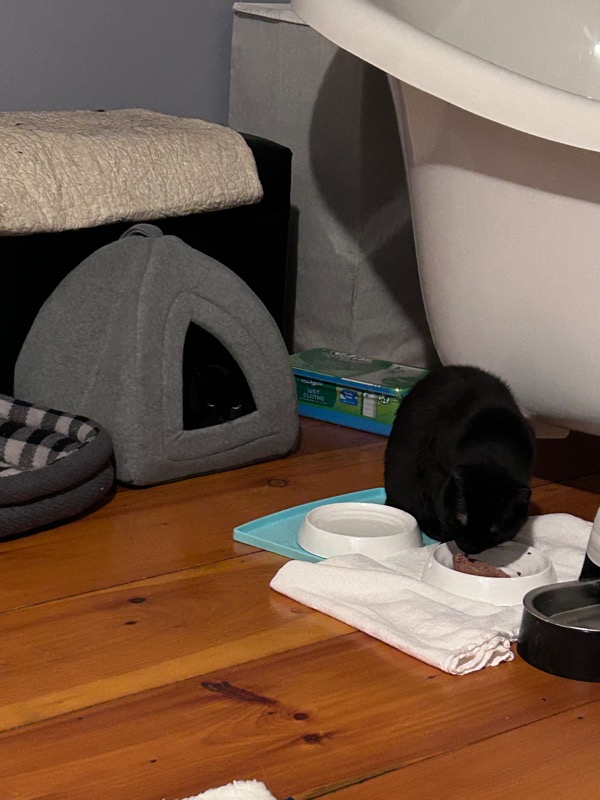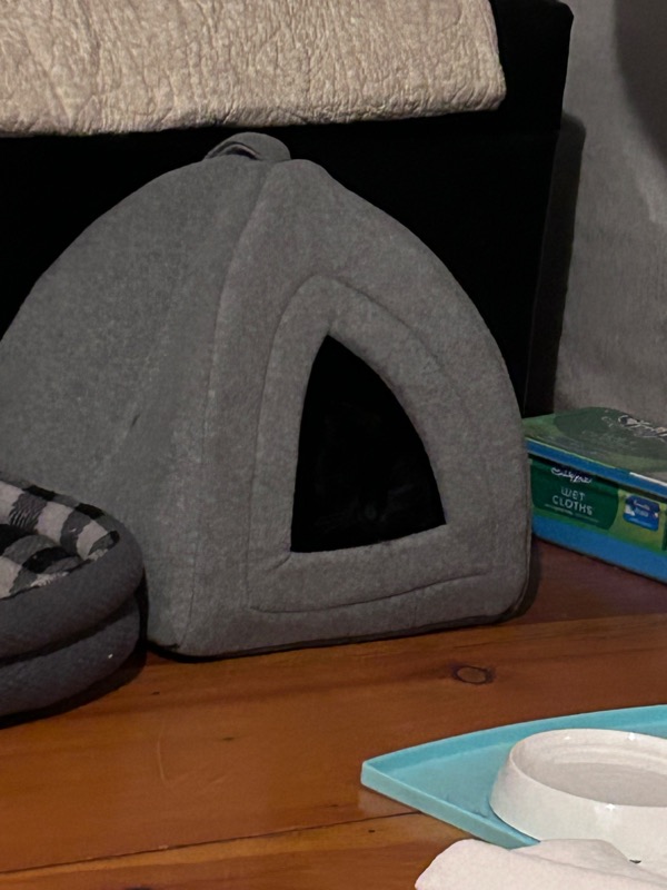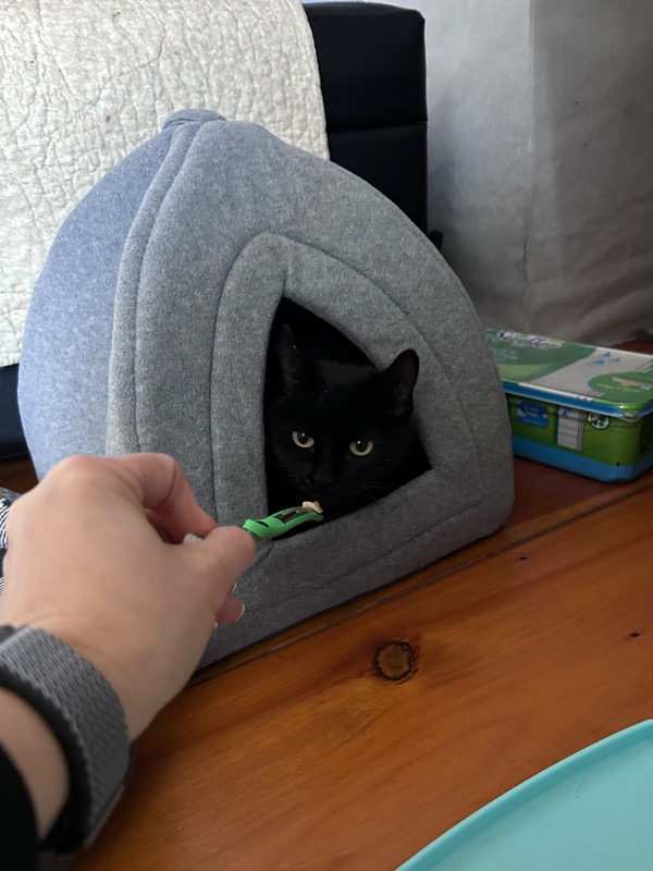 I came into see their food bowl was empty. So rather than just refilling and leaving, I thought I might try Churu on a toothbrush again. Cali was in her pyramid, which meant I had decent access to slowly approach her and offer it to her. Cali ate Churu from toothbrush!!! She sniffed and sniffed, and finally allowed herself to eat the amount on the toothbrush handle. I continued to refill it and offer it, and she ate it. I started out pushing it way inside the pyramid to her, and slowly offered it farther and farther out. She actually poked her head out to eat!