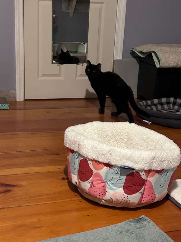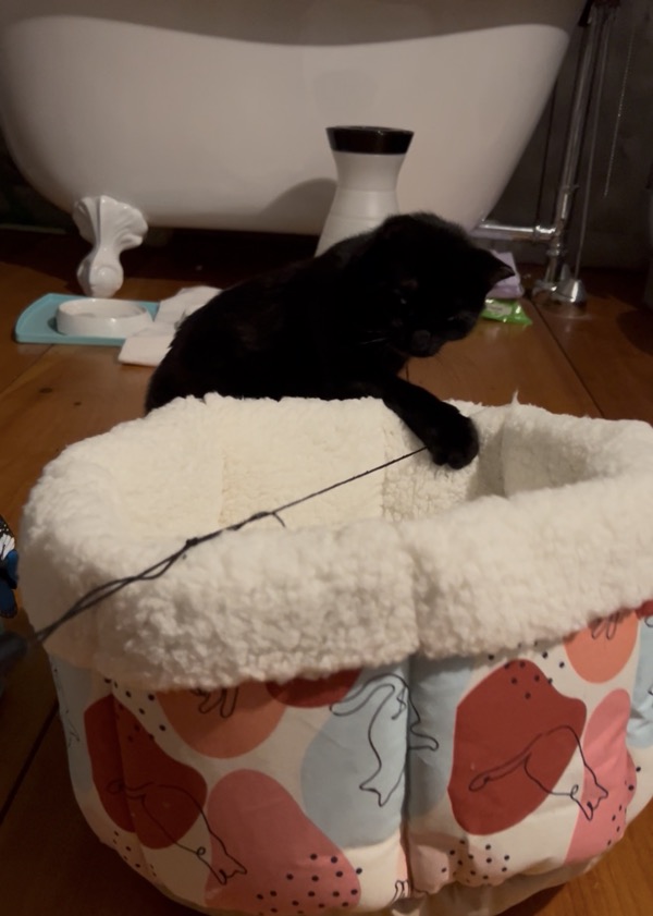 Near bedtime, I went in to see them. After a few destroyed rolls of toilet paper, I decided they needed something different to play with than what I provided. I brought in one of those feathers on a stick type of toys. I had brought it in earlier and it got Henry’s attention, but not enough to do anything about it. I did it again and HENRY PLAYED! He was very hesitant and didn’t PLAY PLAY, but he was very interested, and came closer and closer. And gave it a couple of swats.