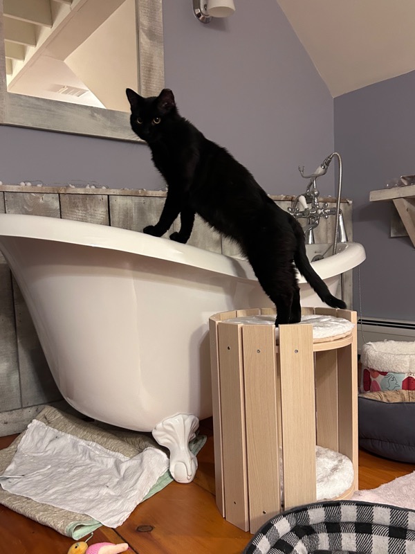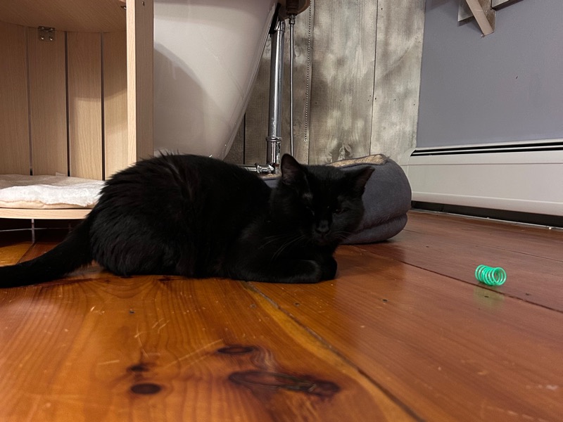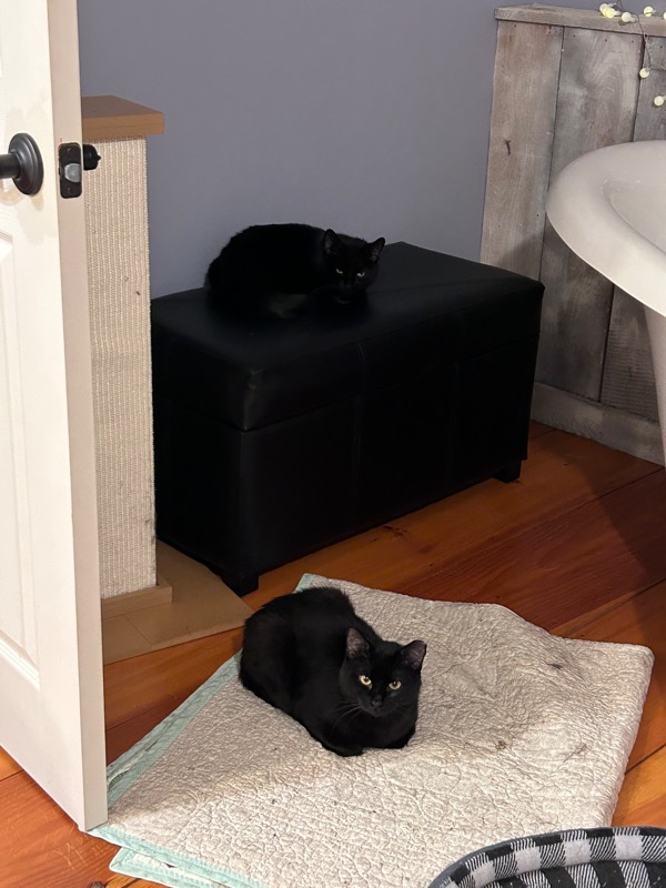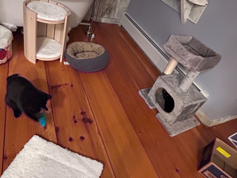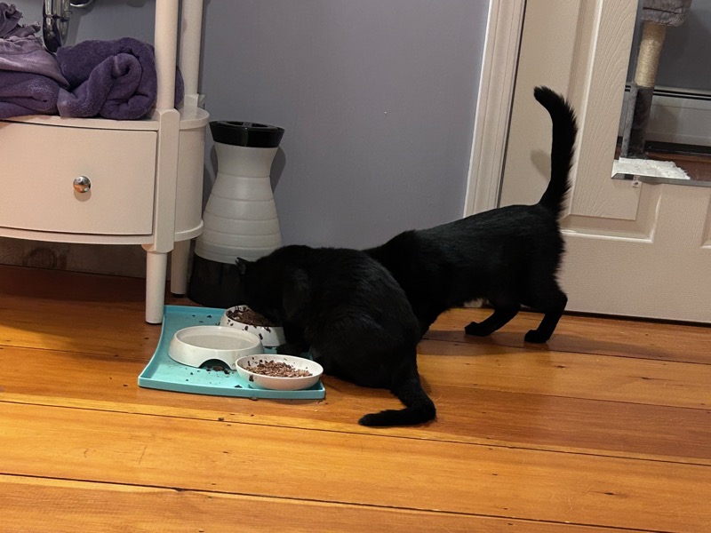 Henry used the litter box while I was in the room. Not sure if that’s a good sign or was just coincidence of timing. Either way, he’s comfortable with my presence. Cali ate another Churu from the ottoman. It’s little scarier than when she’s in the botto of the cat tree. She has the high ground on the ottoman. There’s a non-zero chance she launches herself onto my face.