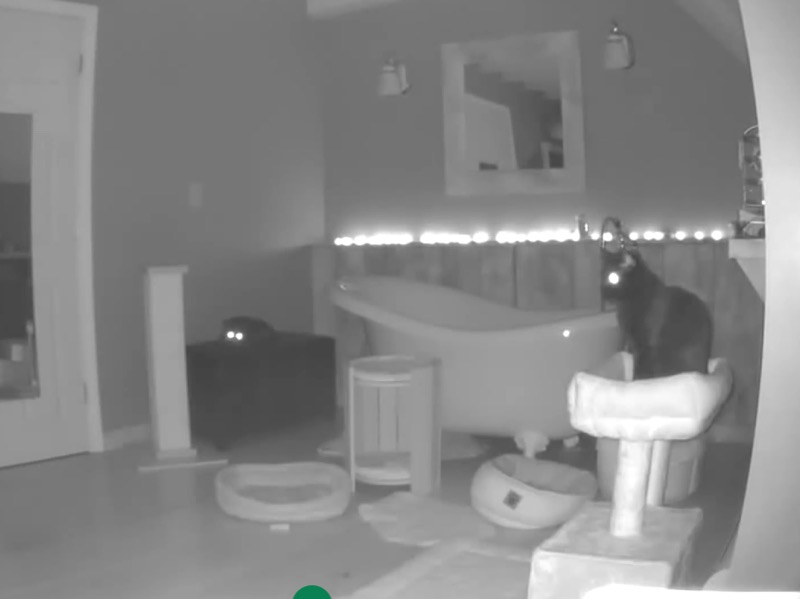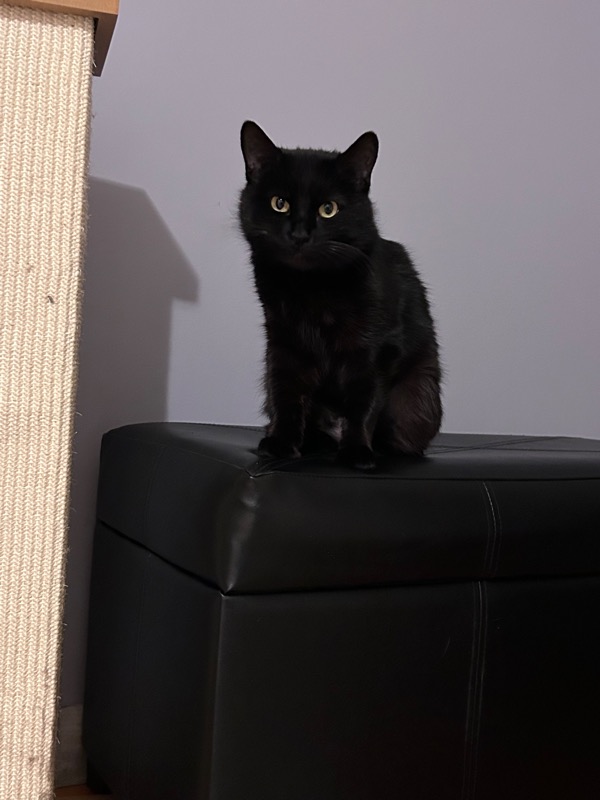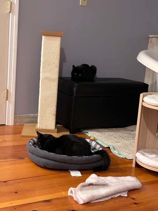 Overnight, she came out and sat on the ottoman for a while with Henry observing from the top of the cat tree.