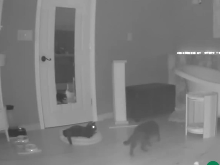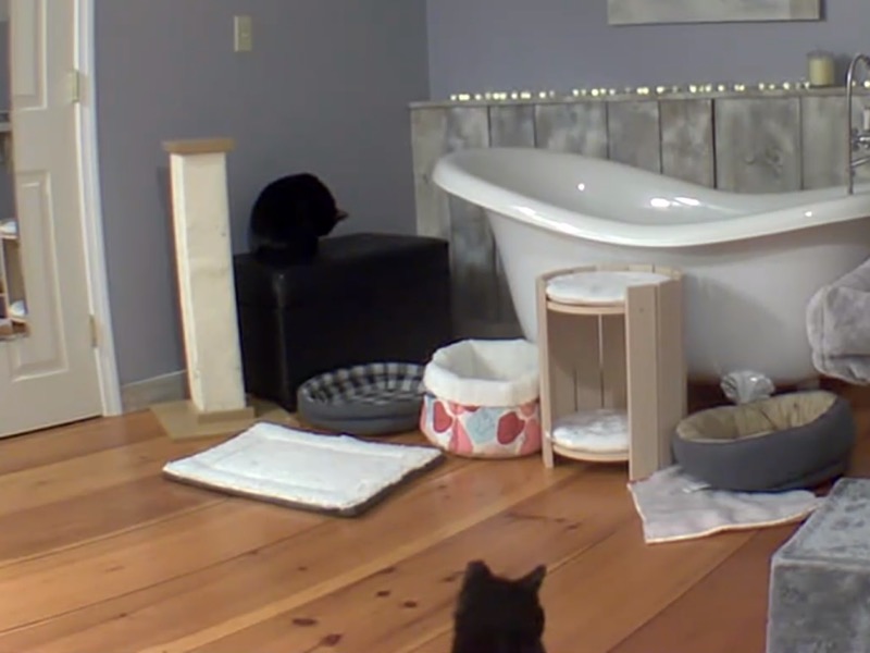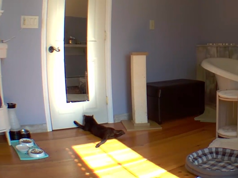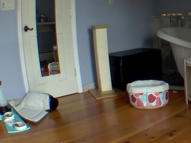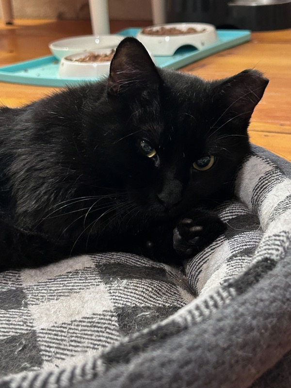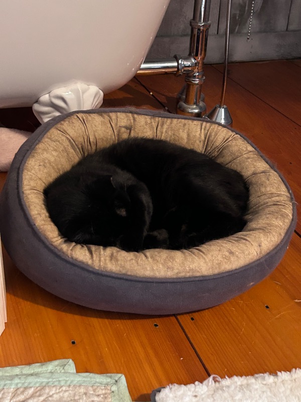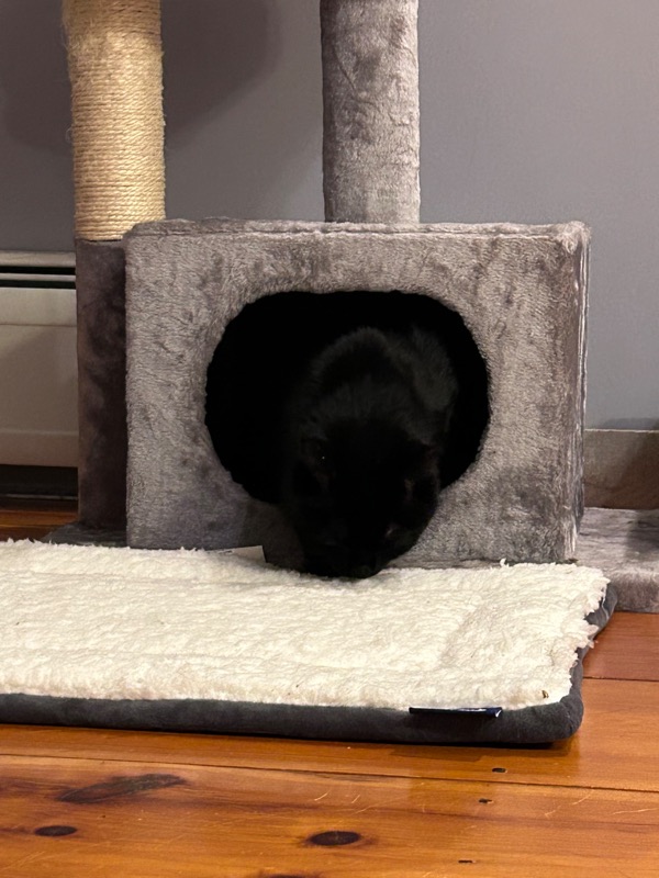 Overnight, Cali got into one of the cat beds on the floor by the door! That’s exciting, another spot that she’s explored out to and felt comfortable enough to sit.