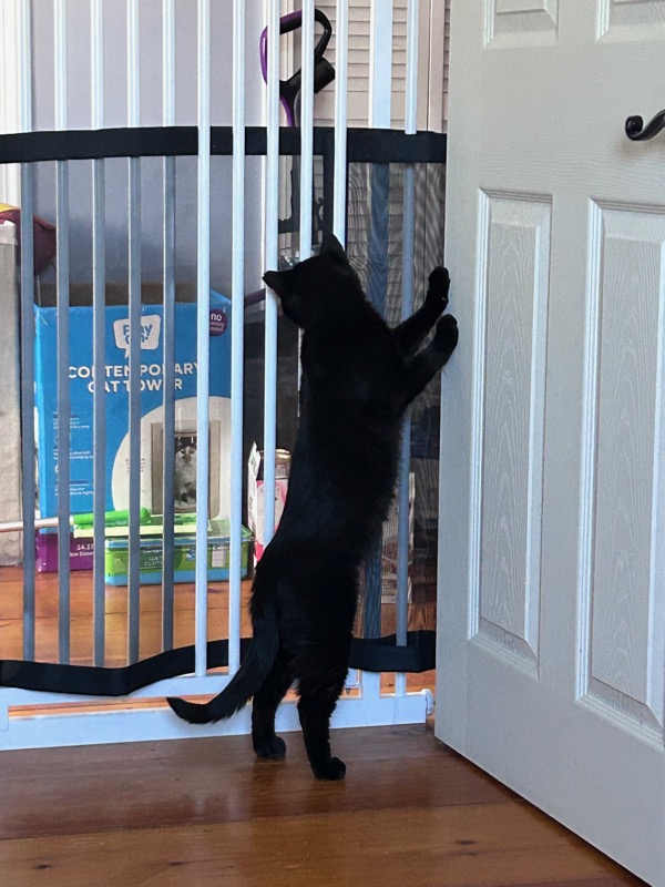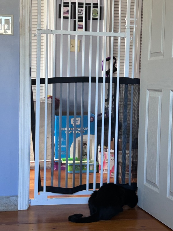 The gate is up! Gwen and Henry interacted (no pics as I try to maintain peace, play, and hand out treats). He got treats. She got pets. Only a couple of hisses were exchanged. I think Gwen could see Cali and Cali could definitely see Gwen. While they don’t interact, I at least want them to know the other exists. Henry keeps going to the door even after Gwen is gone.