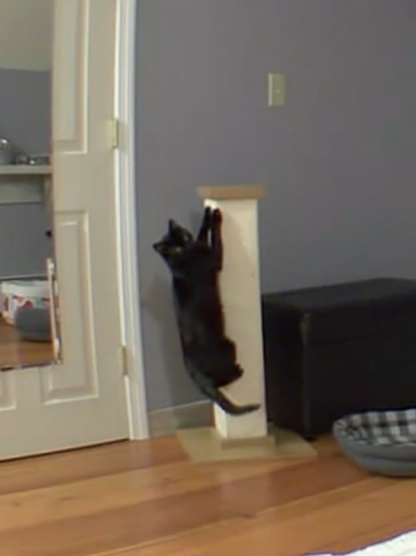 Both of them eating again, in front of me! Cali on the ottoman, with Henry wondering how close he should get. Henry’s unique way of using the cat scratching post, which is to climb it.