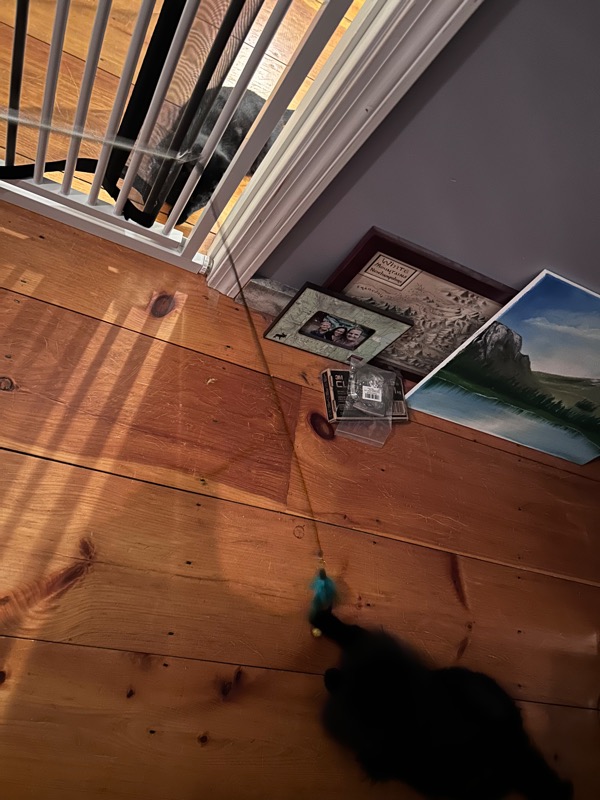 Gwen and Henry batted at the toy through the gate, together at the same time, with no hissing! I’m very happy about that. I do have to make sure I’m there to distract any hard stares, but otherwise it’s going well.