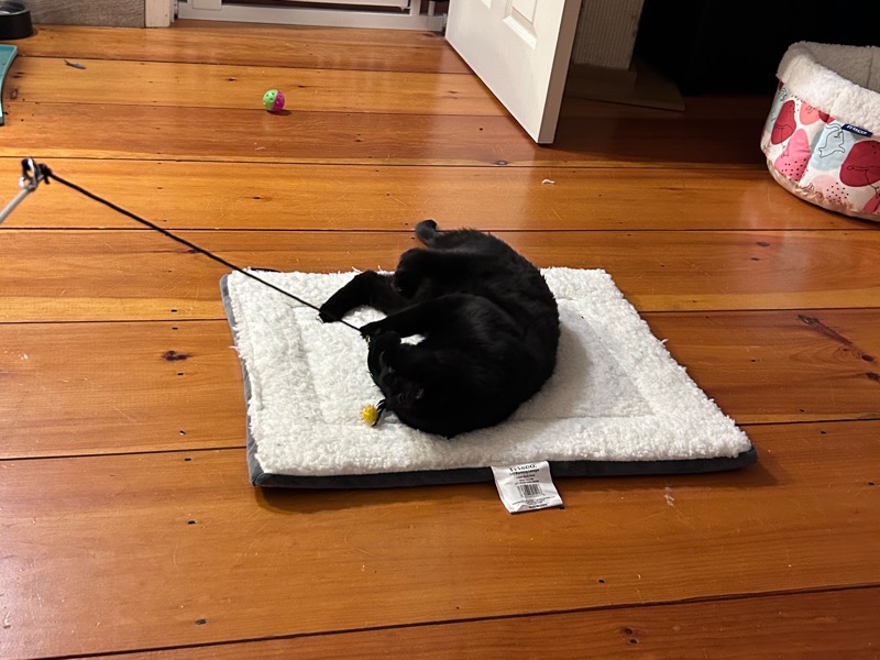 Upper left, he’s gone full blown silly cat, chasing around his beloved green spring, and ending up under one of the beds. Upper right, a boy and his spring. Bottom left, Henry rolling around with the wand toy. Bottom right, Cali keeping an eye on things.