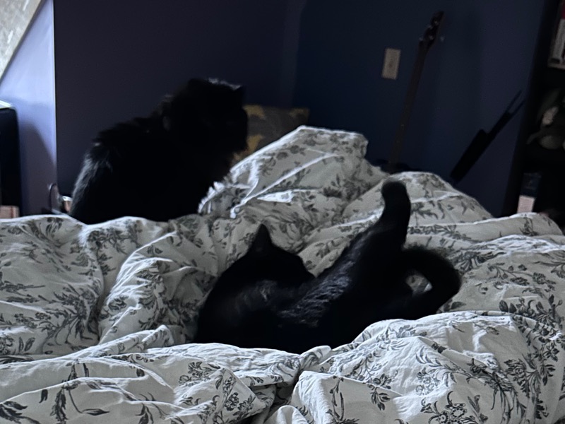 So I think life is mostly back to normal here. I went out yesterday and last night. All the cats were free, commingled, and fine.